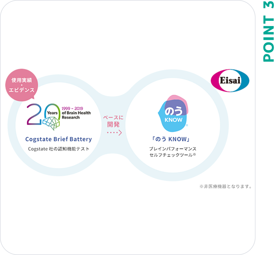 ・Cogstate Ltd.が創出した、海外では医療機器としても承認されている認知機能チェック「Cogstate Brief Battery」を、日本において、エーザイがブレインパフォーマンス(脳の健康度)をセルフチェックするための非医療機器として開発
